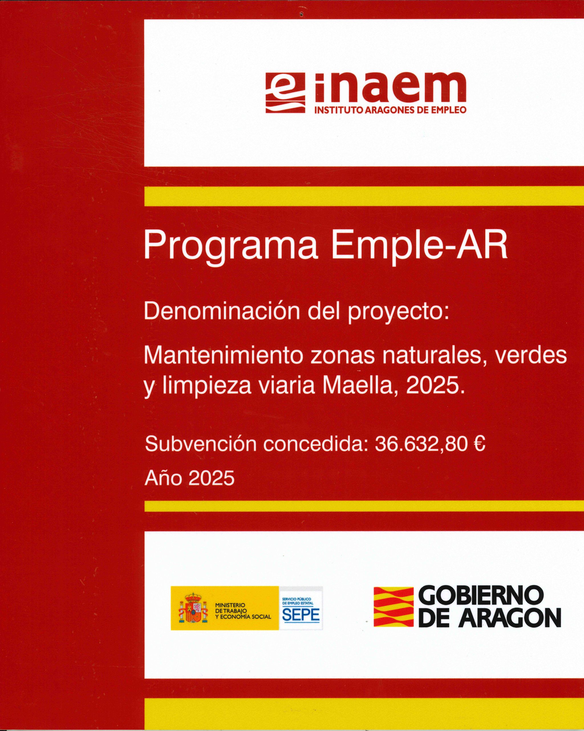 El Ayuntamiento, dentro del programa Emple-AR del Inaem, ha contratado dos personas, con una duración de 10 meses de contrato, a jornada completa, para la realización del programa «Mantenimiento en zonas naturales, verdes y limpieza viaria Maella,2025»