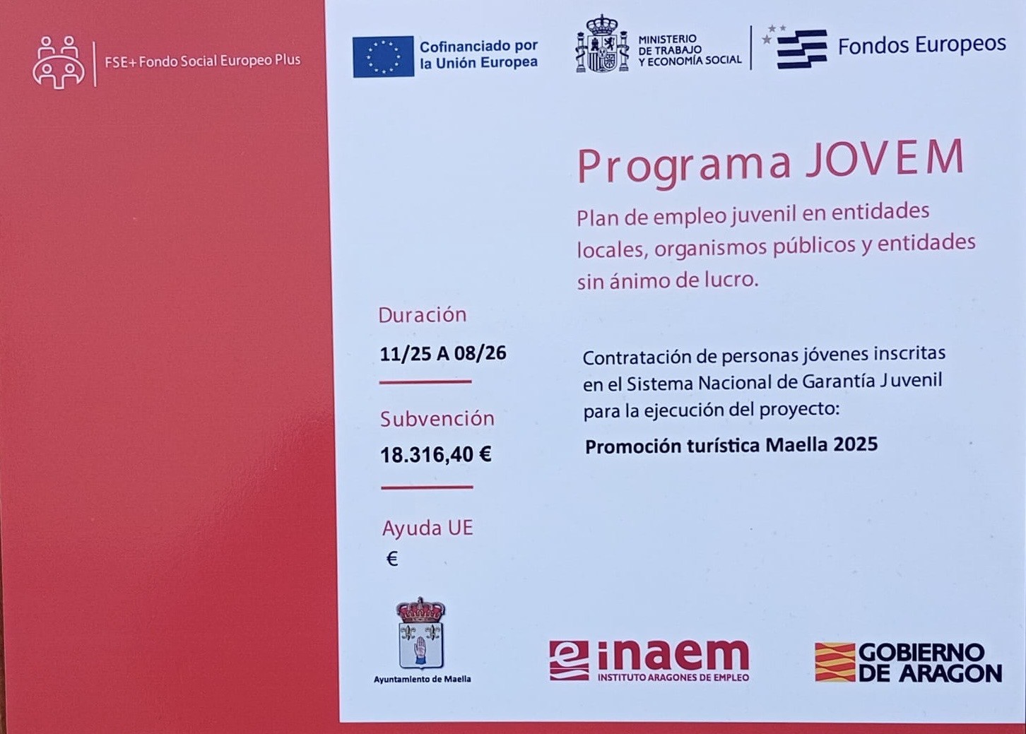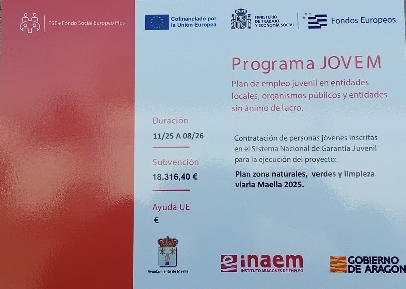 El Ayuntamiento de Maella, dentro del programa Jovem del Inaem, ha contratado a dos personas, con una duración de 10 meses de contrato cada una, a jornada completa, para la realización de los programas siguientes: